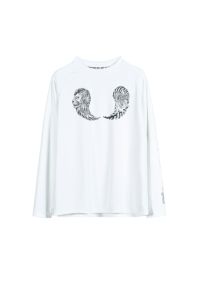 ポリステル素材を使用したロングスリーブTシャツ。 前身頃胸元に虎とライオンのグラフィック、右袖に水と炎が融合した手描き書体のブランドロゴ、背面に2ブランドのネーム、ロゴマークをラバープリント。すべてのグラフィックはマジカルデザイン主宰 内山氏によるデザイン。襟部分にブランドアイデンティティをプリントした消臭テープを叩きつけた仕様。 レギュラーフィットシルエット。黒・白2色、3サイズ展開。マジカルデザインとのコラボレーションモデル。