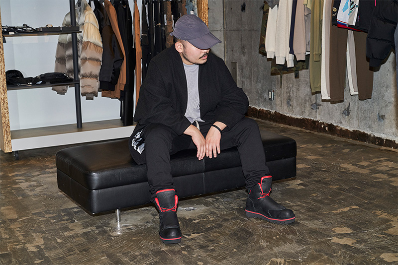 「アウターはタイガリオナ新作の法被ジャケット。インナーは少し前の物になるんですがフィア・オブ・ゴッド、パンツはリックオウエンス ダークシャドウのアイテムです。キャップはノーブランドの私物。ここにダナーのブーツを合わせた感じですね」。